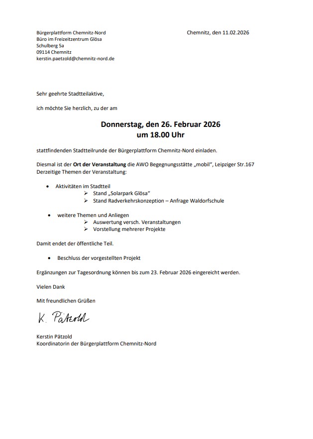 Wir wollen zur nächsten Stadtteilrunde die Projekte und Veranstaltunge für das Jahr 2026 planen und vorbereiten.