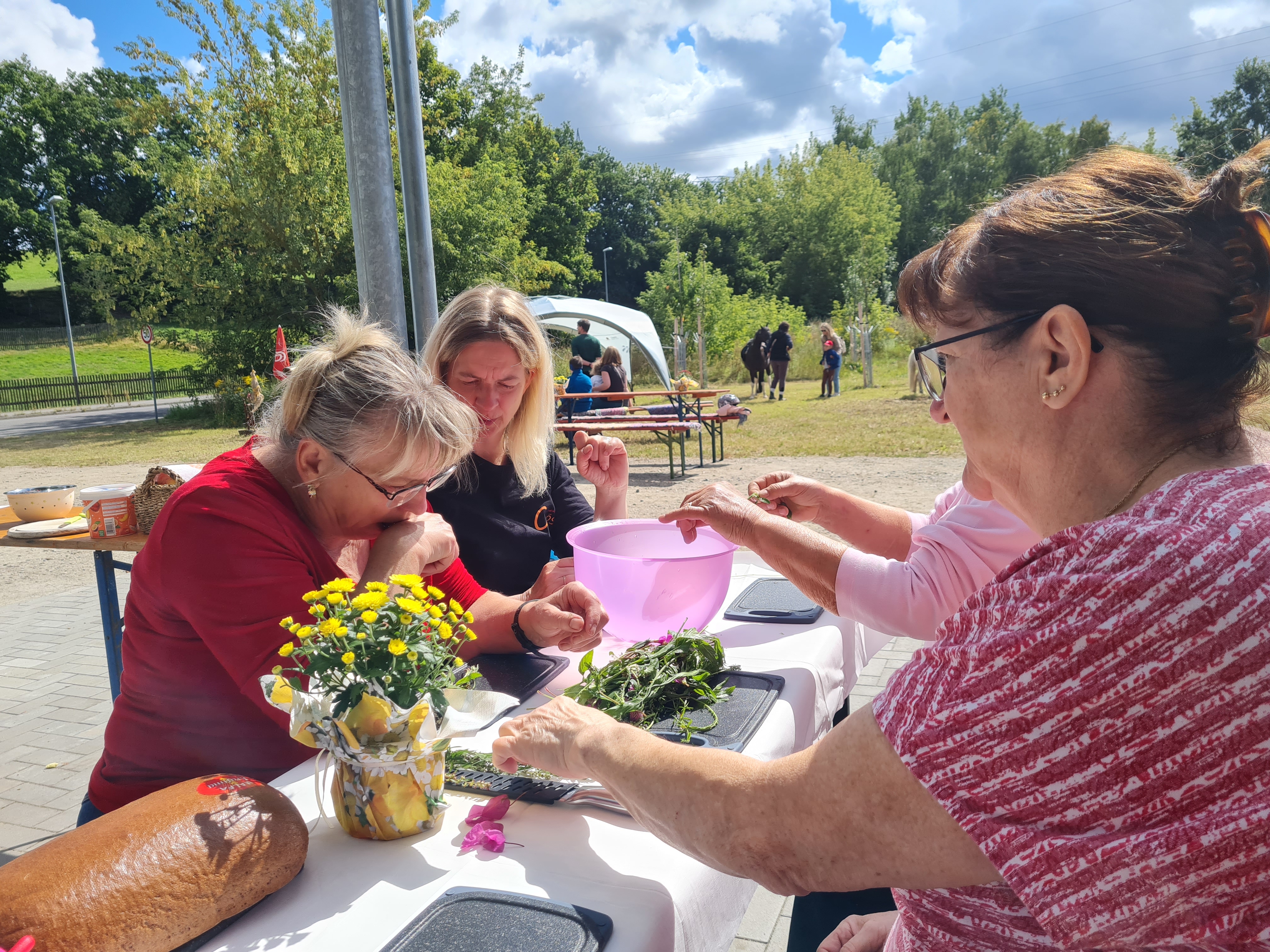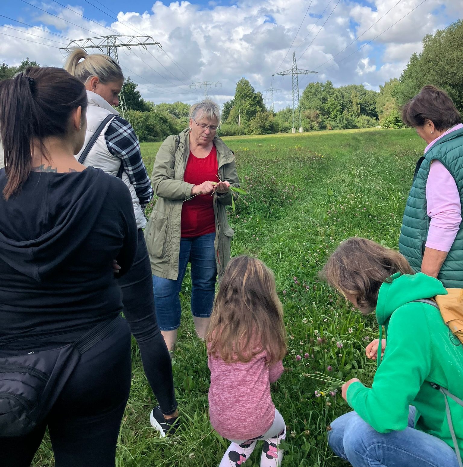 Frau Schidl aus Lichtenstein lädt die Teilnehmer zur Kräuterwanderung ein. Dabei werden verschiedene essbare Kräuter vorgestellt, gesammelt und im Anschluss zu Kräuterbutter verarbeitet.