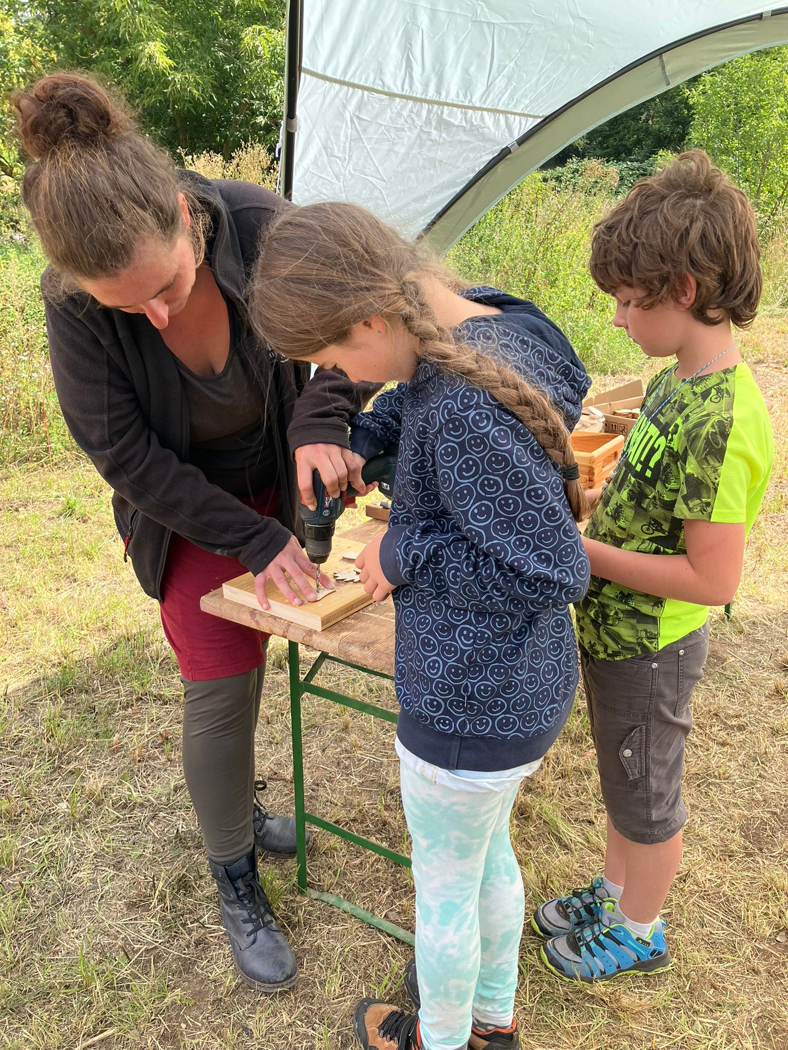 Am Rastplatz gibt es ein Mitmachangebot für Kinder. Es werden Naturketten aus Holzteilen gefertigt. Die Teile werden geschliffen, gebohrt und farbig gestaltet. So entstehen individuelle Anhänger und Mobile.